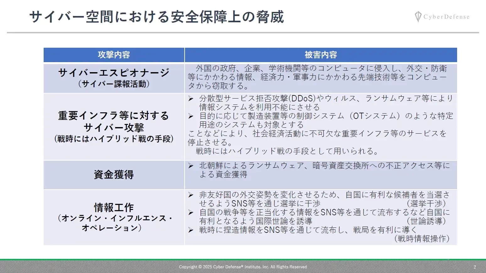 講演では、サイバー空間における安全保障上の脅威を次の4つに整理して説明がなされた。