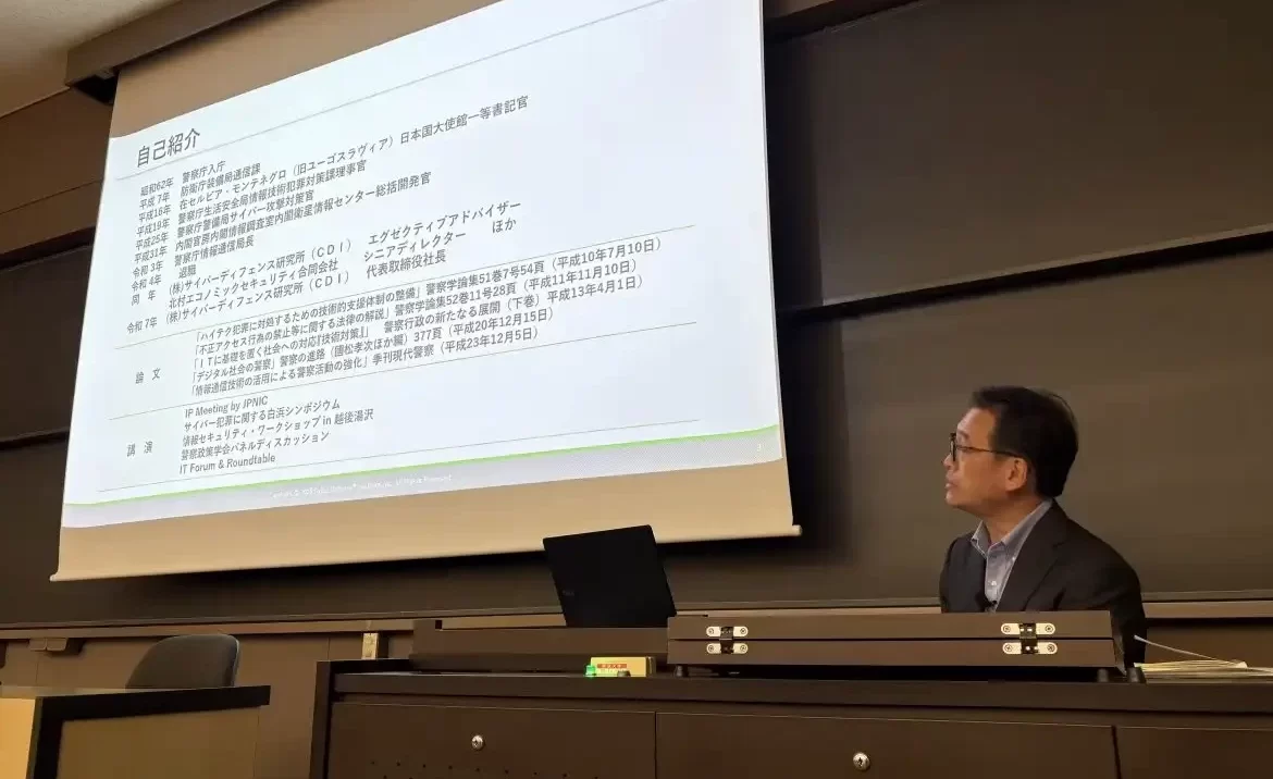 ロシア、中国、北朝鮮などによるサイバー空間の脅威が多層化・高度化する中、日本は2025年5月に「能動的サイバー防御法(重要電子計算機に対する不正な行為による被害の防止に関する法律)」を公布した。本講演では、国際的なサイバー脅威の現状を包括的に整理したうえで、この新法制の中身と実施上の課題について示された。講演者は、警察と防衛の両方の領域で経験を積んできた元警察官僚であり、サイバー空間における安全保障と法制度の「接点」を現場の視点から解説した点が特徴的である。
