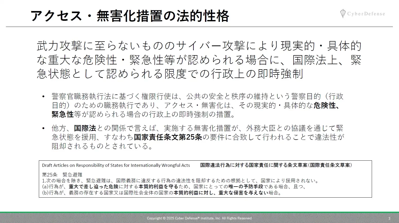 アクセス無害化の発動は、生命・身体・財産に重大な危険が差し迫った局面に限定される。講演者は、「事案が発生し、あるいは、発生している具体的なおそれがある場合に限られ緊急避難的な措置だけに頼るのではなく、平素からどこまで情報収集・技術検証を進めておけるかが鍵だ」と何度か強調した。