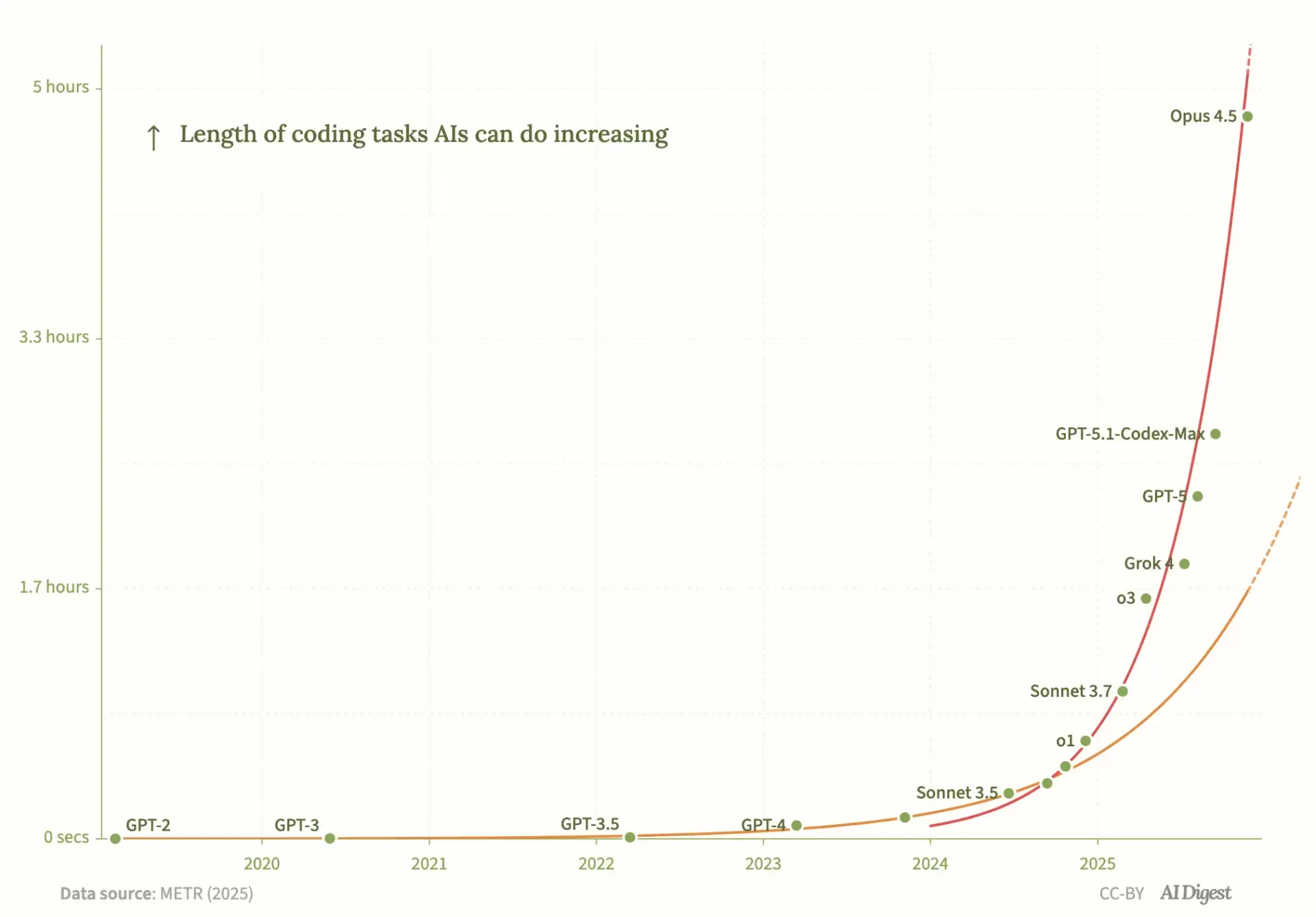 来年には、その自律的に達成できる時間の長さが数日になり、少なくともソフトウェアエンジニアリングの領域では経済的な有用さが大きく増すと思われる。また、この指数関数的に自律性が高まる傾向はあらゆる領域で観測されている。