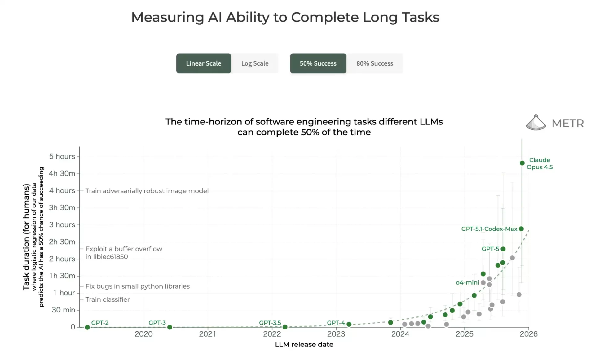 METRの自律性の時間トレンド(図:「Measuring AI Ability to Complete Long Tasks」から)