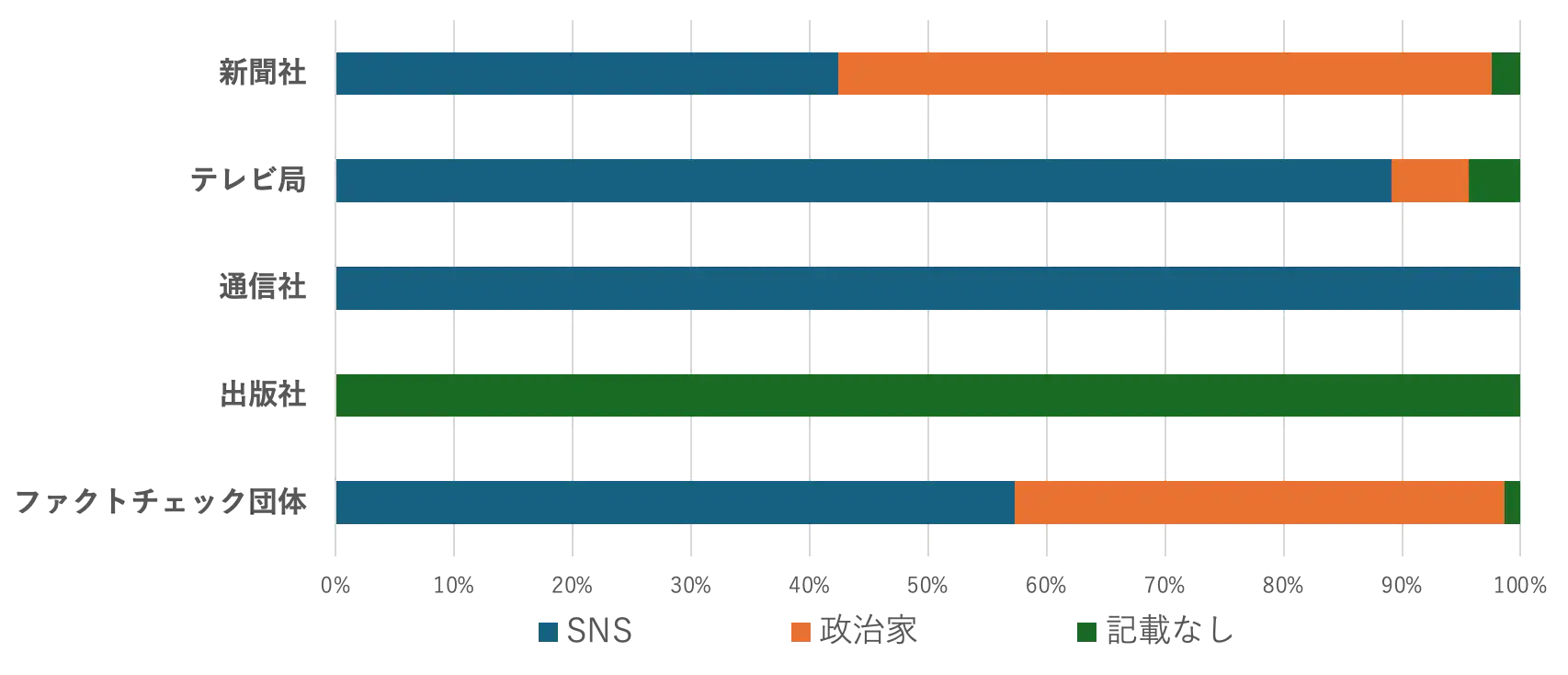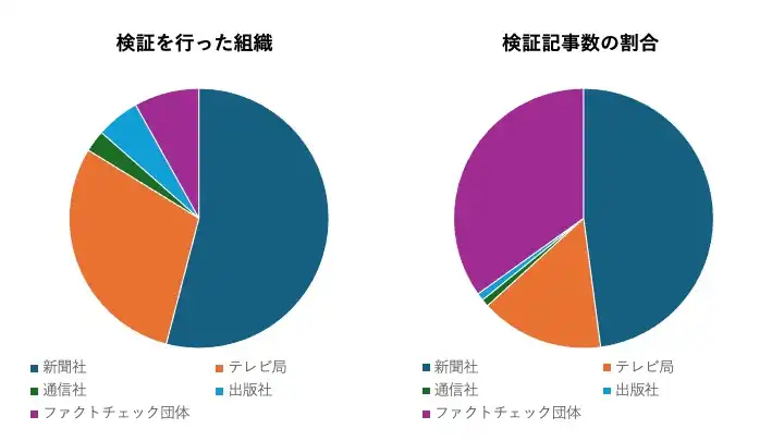 検証を行った組織は、新聞社、テレビ局、通信社、出版社、ファクトチェック団体の5種類で計37あった。検証記事数が最も多かったのは新聞社で103本、次いでファクトチェック団体が75本、テレビ局が33本、通信社と出版社がそれぞれ2本で、検証活動は主に新聞社とファクトチェック団体が中心に行われていたということになる。