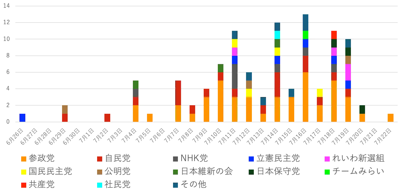 7月3日の公示日前後はほとんどないが,20日の投・開票日が近づくにつれて検証記事が増加していること、参政党が多いこと、といった傾向はXのコミュニティノートの付与状況とよく似ている。