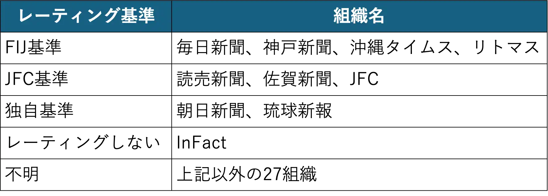 このFIJ基準以外に、ファクトチェック団体の「JFC基準」「メディアの独自基準」「レーティングしない」の4種類があることが分かった。「FIJ基準」を採用している組織は毎日新聞、佐賀新聞、沖縄タイムス、リトマス。「JFC基準」を採用している組織は、読売新聞、佐賀新聞、JFC。「独自基準」は朝日新聞と琉球新報である。朝日新聞はFIJ基準を採用していたが独自基準に変更している。ほとんどの組織はレーティング基準が不明である。