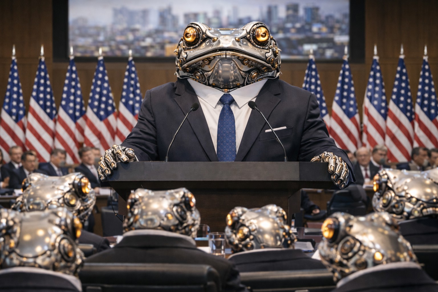 先述のとおり、米国政府の代表としてAI Impact Summitに参加したのは、元ホワイトハウス科学技術政策局補佐官のマイケル・クラツィオスだった。彼はサミット最終日にあたる2026年2月20日、米国務次官や米商務次官らとともに基調講演の檀上にあがり、「国際的なガバナンスを完全に拒絶する」と高らかに宣言した。それは14人のAI業界のリーダーたちが(ぎこちなくも)笑顔で手を繋ぎ、国際的な調和を強調するようなパフォーマンスを見せた翌朝のことだった。クラツィオスは以下のように発言している。